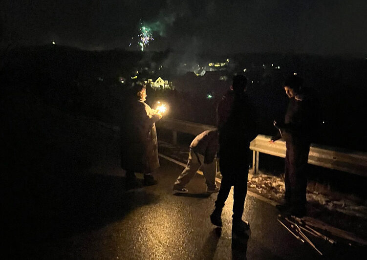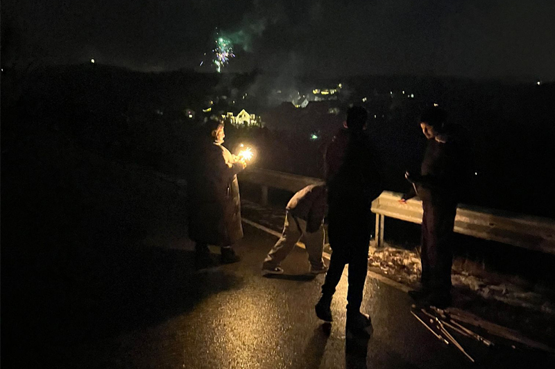 Gegen 23:40 Uhr machten wir uns gemeinsam auf den Weg zu einer Anhöhe, um das Feuerwerk von Lieberhausen zu bestaunen. Dort mussten wir noch ein wenig warten und vertrieben uns die Zeit, während bereits die ersten Raketen am Himmel zu sehen waren. Die Lichter flogen über den Himmel, die Vorfreude war deutlich spürbar.